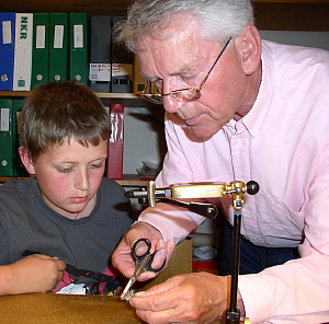| Fluebinding er for alle aldre, og Knud lærer gerne vores junior Nick, hvordan en giftig flue skabes. |